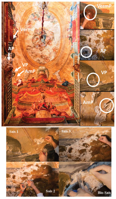 ![]() Figura 2. Acima, zonas de amostragem da pintura mural da Sala do Trono do Palácio Nacional de Mafra, Portugal (fotografia de Sofia Lopes, 2017). Detalhes das áreas degradadas estão mostradas no painel à direita. As definições das siglas usadas (VermP, AP, VP e AmP) são dadas no texto;abaixo, amostragem das eflorescências observadas na pintura