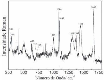 RESULTADOS E DISCUSSÃO Dentre as principais vantagens do uso das técnicas de microscopia vibracional em bens culturais, destaca-se o seu caráter não destrutivo e o fato de requererem amostras de dimensão micrométrica para a realização das análises, atendendo às necessidades de preservação dos bens. Na investigação das eflorescências na pintura "Barco com bandeirinhas e pássaros", por se tratar de uma obra em têmpera (confeccionada pela mistura de aglutinantes proteicos e pigmentos), tanto a possibilidade de se tratar da migração de substância aglutinante do meio, quanto da colonização de micro-organismos (biodeterioração devido à presença de material proteico) foram, primeiramente, consideradas. Nessa etapa, a análise prévia por microscopia óptica permitiu descartar a hipótese de biodeterioração, porque as estruturas características dos diversos tipos de micro-organismos não foram observadas. O espectro Raman obtido da amostra de eflorescência coletada (Figura 3) apresenta principais bandas em 1666, 1445, 1367, 1309, 1097, 1086, 999 e 636 cm-1, com os conjuntos de bandas em 1086, 710 e 298 cm-1, e 1097, 723 e 280 cm-1 atribuídos a carbonato de cálcio (CaCO3) e a carbonato duplo de cálcio e magnésio (CaMg(CO3)2), respectivamente.15,16 Os espectros Raman atribuídos a CaCO3 e CaMg(CO3)2 reportados são, na ordem citada, compatíveis com a forma calcita e dolomita desses compostos.
