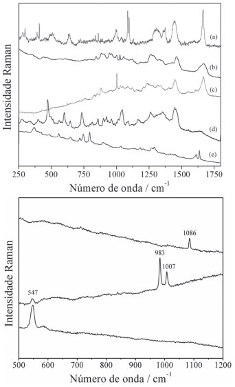 ![]() Figura 4. Acima: (a) Espectros Raman (λ0 = 785 nm) da eflorescência coletada da obra "Barco com bandeirinha e pássaros", e dos padrões de (b) gelatina, (c) ovoalbumina, (d) cola de boi e (e) eugenol; abaixo: espectros Raman (λ0 = 785 nm) em diferentes pontos da amostra de eflorescência coletada da obra "Barco com bandeirinha e pássaros"