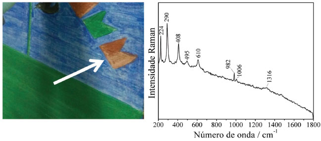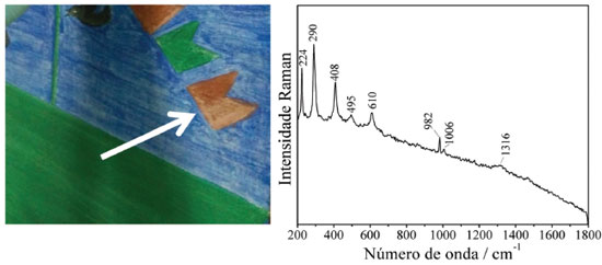 ![]() Figura 5. À esquerda, fotografia evidenciando o embranquecimento da camada pictórica vermelha na pintura "Barco com bandeirinhas e pássaros", verificada na segunda etapa de investigação. À direita, espectro Raman médio obtido para o fragmento de camada pictórica vermelha (Vermelho1)