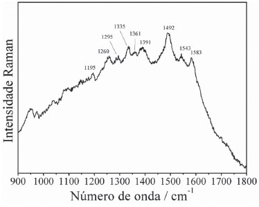 A análise do pigmento vermelho (amostra Vermelho1) revelou a presença do pigmento vermelho hematita (α-Fe2O3, bandas características em 224, 290, 408, 495, 610, e 1316 cm-1) na composição da camada pictórica, além de BaSO4 (982 cm-1) e CaSO4 (1006 cm-1), como mostrado à direita na Figura 5. Como as amostras de eflorescência apresentaram grande luminescência na análise Raman (o que impediu a obtenção de informações químicas), os materiais amostrados em fitas de carbono, previamente recobertos por ouro para a análise SEM, foram analisados por microscopia Raman. Essa estratégia é justificada pela esperada supressão de luminescência de substâncias em contato com partículas metálicas (nesse caso, ouro).25 Como resultado, das 8 amostras em stubs (8 diferentes áreas de coleta), apenas uma das amostras coletadas (denominada Eflorescência_Azul2) apresentou espectro Raman (Figura 6), mostrando um perfil bastante similar ao verificado para leveduras26 apesar da baixa razão sinal/ruído.