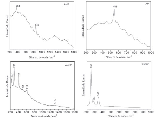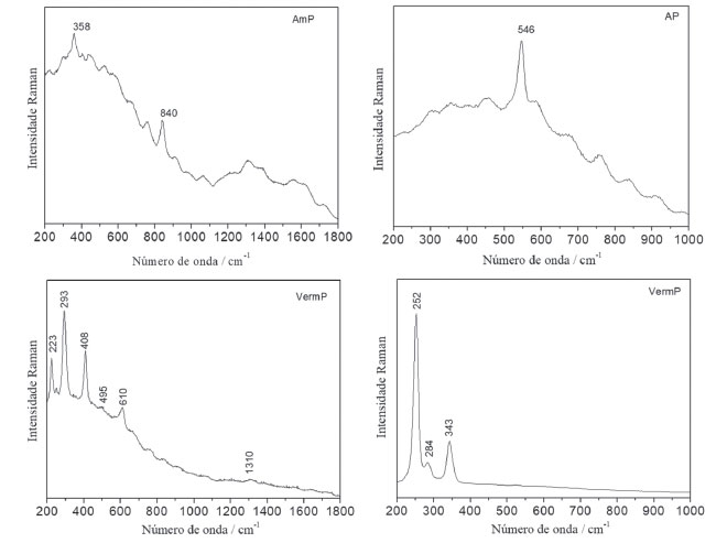 ![]() Figura 7. Espectro Raman (λ0 = 785 nm) dos microfragmentos das camadas pictóricas amarela (AmP), azul (AP) e vermelha (VermP) da região degradada da pintura mural