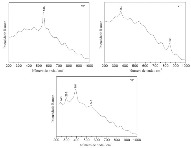 ![]() Figura 8. Espectros Raman (λ0 = 785 nm) do microfragmento da camada pictórica verde (VP) da região degradada da pintura mural