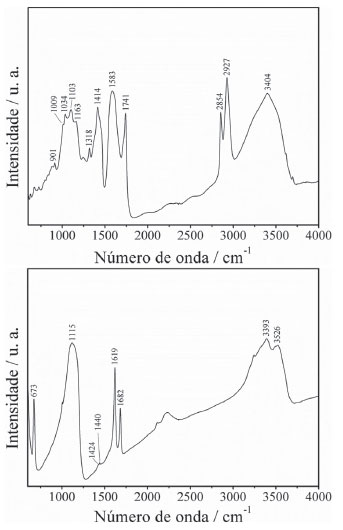 É interessante notar que a presença do pigmento amarelo PbCrO4 sugere anterior intervenção de restauro, uma vez que este pigmento foi introduzido em 1809 e disponibilizado comercialmente a partir de 181530 (datas posteriores à data de finalização da pintura, 1807). O diagnóstico de anterior intervenção de restauro, por sua vez, permite supor que a degradação observada pode ser recorrente. Além das já mencionadas vantagens do uso da espectroscopia vibracional em bens culturais, como seu caráter virtualmente não invasivo, merece destaque a complementaridade existente entre a espectroscopia Raman e a espectroscopia de absorção no infravermelho,31 que consiste no fato de que transições permitidas em uma podem não sê-lo na outra, o que atribui uma grande vantagem na união dessas técnicas na investigação de diferentes substâncias em matrizes complexas. Um exemplo da aplicação direta desse princípio, nos estudos aqui apresentados, é a identificação do meio aglutinante empregado na produção das tintas da pintura mural da Sala do Trono do Palácio Nacional de Mafra, que complementa a caracterização dos pigmentos obtida por microscopia Raman. Nesse estudo, a substância aglutinante empregada foi identificada como óleo, como mostra o espectro µ-FTIR da amostra AmP (camada pictórica amarela), na Figura 9 – acima. Nesse caso, a presença de óleo na composição da camada pictórica é evidente pela observação das bandas em 2927 e 2854 cm-1 (estiramento C-H) e 1741 cm-1 (estiramento C=O), típica desses compostos,32 embora o tipo específico de óleo seja dificilmente distinguido pela técnica devido à similaridade de composição dessas substâncias.33