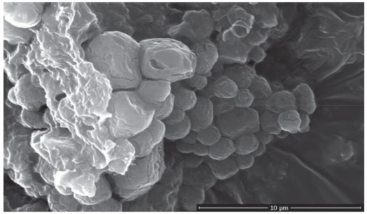 É oportuno destacar que quando se objetiva a identificação do tipo de óleo usado na produção de tintas, técnicas destrutivas e que demandam maior quantidade de amostra, como cromatografia gasosa acoplada a espectrometria de massa (GC-MS), devem ser usadas para estimar as frações de ácidos graxos que caracterizam determinados óleos vegetais. Outra vantagem oferecida pela espectroscopia FTIR é demonstrada na análise das eflorescências coletadas da pintura mural, uma vez que o material apresentou grande luminescência, impedindo a observação do espectro Raman. Na análise dos materiais eflorescentes (Sais 1, 2 e 3) por µ-FTIR (espectro da amostra Sais 1 na Figura 9 – abaixo), CaSO4∙2H2O (gesso) foi identificado como o composto majoritário pela presença de bandas da água em aproximadamente 3526 (ν3, estiramento antissimétrico O-H), 3393 cm-1 (ν1, estiramento simétrico O-H), 1682 e 1619 cm-1 (deformação angular O-H; frequências relativas a moléculas de água em duas diferentes simetrias),34 e do íon sulfato em 1115 cm-1 (ν3, estiramento antissimétrico S-O) e 673 cm-1 (deformação angular S-O);35 essa identificação foi confirmada por XRD (valores característicos de 2? em 20,8º, 29,2º, 31,1º, 32,0º, 33,4º, 36,0º, 40,7º e 43,3º, não mostrado). A presença de um dubleto em aproximadamente 1441 e 1424 cm-1 nos espectros µ-FTIR das eflorescências (Figura 9 – abaixo) levantou, a princípio, a suspeita da presença de CaCO336 na composição das eflorescências, atribuindo tal característica à diminuição da simetria das espécies CO32- que leva à perda da degenerescência do modo ν3 (estiramento antissimétrico) duplamente degenerado,37 o que é comum a polimorfos do carbonato de cálcio. No entanto, uma separação de tal magnitude (aproximadamente 15 cm-1) é comparativamente discreta em relação ao observado para os polimorfos de CaCO3 (aproximadamente 27 cm-1 para a forma vaterita, e aproximadamente 50 cm-1 para a forma aragonita);38 considerando ainda a pequena intensidade das duas bandas não é possível afirmar a partir dos espectros FTIR que carbonato de cálcio esteja presente nas eflorescências salinas. Como já demonstrado, a caracterização das heterogeneidades da composição em bens culturais contribui sensivelmente para a compreensão dos processos de degradação que possam estar em curso. Essa heterogeneidade, entretanto, algumas vezes só pode ser verificada em escala nanométrica, o que não é possível com o uso de técnicas baseadas em microscopia óptica devido à limitação da resolução na obtenção de imagens (dado pelo limite de difração de Bragg). Nesse cenário, a microscopia eletrônica de varredura (SEM) se apresenta como uma excelente alternativa, considerando sua capacidade de obter informações topográficas e morfológica com resolução de poucas dezenas de nanômetros, explorando fenômenos associados à interação do feixe de elétrons com a matéria. Na complementação dos resultados obtidos na investigação das eflorescências na pintura "Barco com bandeirinhas e pássaros", por exemplo, a amostra Eflorescência_Azul2, que apresentou espectro Raman similar ao de leveduras, foi submetida à análise SEM, com as micrografias obtidas (Figura 10) revelando a presença de estruturas ovaladas e circulares, bastante similares à estrutura deste micro-organismo.39
