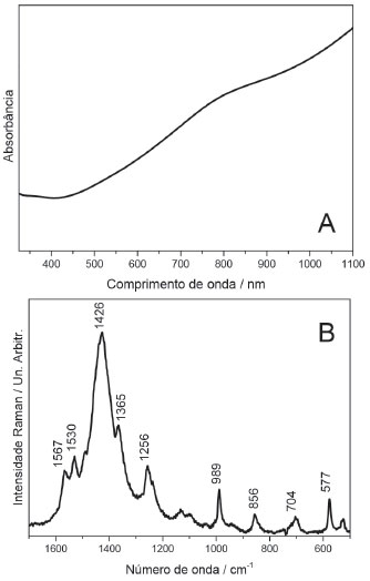 ![]() Figura 2. A-Espectro UV-VIS do filme de PEDOT:PSS e B-Espectro Raman ressonante do PEDOT:PSS (λ0=633 nm)