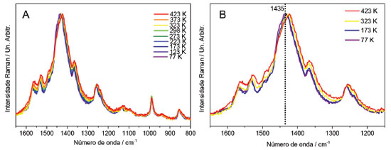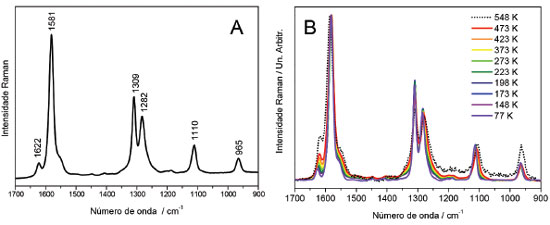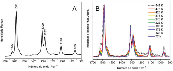 ![]() Figura 3. A-Espectros Raman ressonante in situ do PEDOT:PSS em diferentes temperaturas B-Espectros Raman mostrados em A na região entre 1650 e 1150 cm-1 (λ0=633 nm)