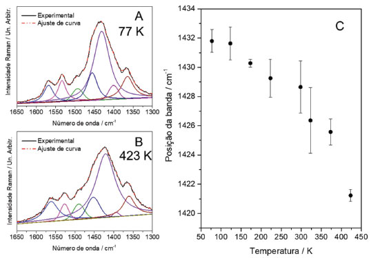 ![]() Figura 4. A - Ajuste de curva para o espectro Raman ressonante do PEDOT:PSS à 77K e B - Ajuste de curva para o espectro Raman ressonante do PEDOT:PSS à 423K. C – Posição da banda νsim Cα–Cβ em função da temperatura no intervalo de 77 a 423 K (λ0=633 nm)