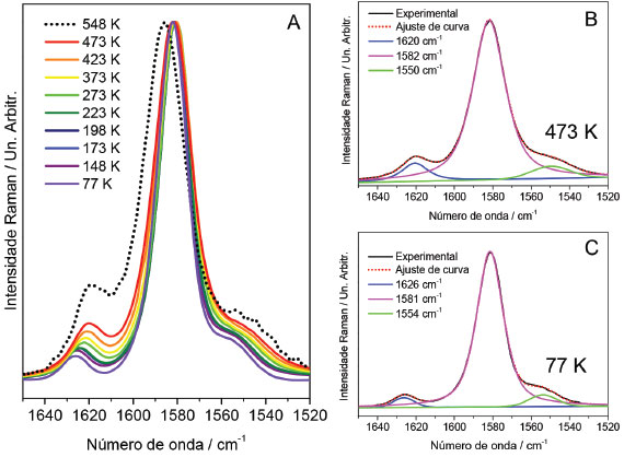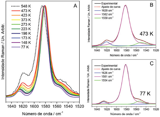 ![]() Figura 6. A – Espectro Raman do MEH-PPV em diferentes temperaturas no intervalo de 1650 até 1520 cm-1 (λ0=785 nm), B e C – Ajuste de curva para os espectros em 473 e 77 K, respectivamente