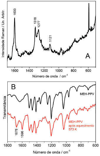 ![]() Figura 7. A – Espectro Raman do produto de degradação do MEH-PPV (λ0=785 nm) e B espectros FT-IR do MEH-PPV e do MEH-PPV após aquecimento em 573K