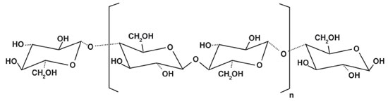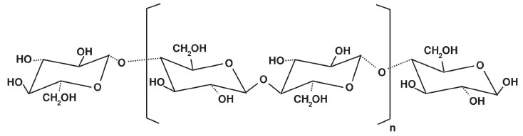 ![]() Figura 1. Estrutura molecular da celulose baseada no monômero α-D-glucose com unidades β-1,4-glicosídicas ligadas