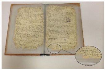 A cadeia polimérica da celulose pode ser degradada por hidrólise e/ou oxidação.4 Um problema fundamental na conservação e restauro é a identificação e compreensão dos mecanismos de degradação da celulose, usando para isso, sempre que possível, métodos não destrutivos como a espectroscopia de espalhamento Raman e de absorção no infravermelho. Os benefícios da espectroscopia Raman, ou mais especificamente da microscopia Raman, são o fato de permitir análises não destrutivas e sondar áreas muito pequenas de amostras, bem como geralmente dispensar qualquer tipo de manipulação da amostra. Por essa razão tem sido empregada na investigação do envelhecimento de papéis. Neste trabalho, microscopia Raman e FTIR foram utilizadas na identificação do tipo de celulose e do estado de degradação do papel que foi utilizado em um manuscrito do século XVI. O documento em questão é o Inventário do Sapateiro Damião Simões (1578), o mais antigo do Arquivo Público do Estado de São Paulo. O documento é mostrado na Figura 2, na qual é possível notar que o papel está amarelado e danificado, especialmente nas bordas. Além disso, há algumas décadas o documento sofreu um processo de laminação (plastificação), que consiste na aplicação em ambos os lados do documento de um filme termoplástico, na tentativa de preservá-lo; essa prática foi empregada nas décadas de 1950 e 1960, porém hoje em dia esse processo não é mais utilizado.
