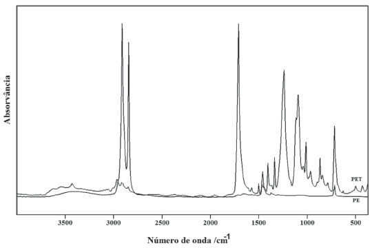 ![]() Figura 3. Espectros FTIR dos polímeros polietileno (PE) e poli (tereftalato de etileno) (PET) usados na laminação do Inventário