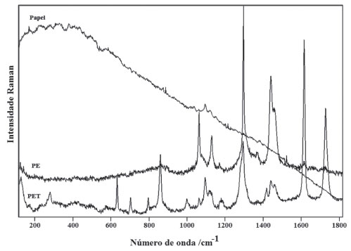 RESULTADOS E DISCUSSÃO Como já foi dito anteriormente, o documento de 1578 (Inventário) teve suas páginas plastificadas, uma prática comum nos anos 1950 e 19608 que tinha por objetivo melhorar a aparência e proteger a folha impressa por aumentar a resistência ao atrito e servir como barreira à umidade, à gordura etc. O processo de plastificação ou laminação mais comum aplica, sob pressão e calor, um filme de polietileno (PE) com espessura de 12 a 15 µm sobre o documento; para impedir a aderência do filme de polietileno ao cilindro térmico usa-se, como agente desmoldante, uma película de poliéster (poli (tereftalato de etileno), PET) que possui alta temperatura de fusão (260 ºC) na espessura de 18 a 23 µm.9 O método utilizado atualmente pelo Arquivo Público do Estado de São Paulo na restauração de documentos históricos com suporte em papel emprega papel japonês,6 o que tornaria necessária a remoção da matriz polimérica. Nesse sentido, a possibilidade de remoção foi investigada inicialmente por meio da caracterização dos polímeros a fim de verificar se tem a mesma composição química dos produtos comerciais atualmente no mercado. Para isso foram utilizadas as espectroscopias FTIR e microscopia Raman; nesse último caso, a alta resolução espacial (poucos µm2) permitiu a análise das distintas camadas observadas em um corte transversal (corte estratigráfico) de um pequeno fragmento de amostra proveniente do Inventário. A Figura 3 mostra os espectros FTIR do fragmento extraído do Inventário; é possível ver que há bandas de dois polímeros distintos e apesar de se poder distinguir pelo perfil espectral que se tratava de PE e PET, aqueceu-se ligeiramente a amostra até que fosse possível remover uma pequena porção do polímero mais interno (em contato direto com o papel) e o espectro FTIR obtido (Figura 3, PE) confirmou que se tratava de polietileno, com bandas características10 em 1067 e 1128 cm-1 (ν(CC)), 1298 e 1458 cm-1 (δ(CH2)) e 2847 e 2886 cm-1 (ν(CH)). A análise do corte estratigráfico do fragmento removido do Inventário feita por microscopia Raman (Figura 4) confirmou que o polímero em contato com o cilindro aquecido era poli (tereftalato de etileno), o qual apresenta bandas em 1615 cm-1 (ν(CC) do anel benzênico) e 1728 cm-1 (ν(CO)); a microscopia Raman confirmou também a identidade do polímero mais interno como sendo PE.