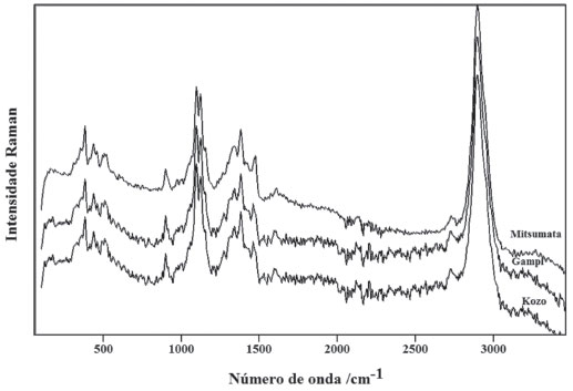 ![]() Figura 7. Espectros FT-Raman dos papéis japoneses Kozo, Gampi e Mitsumata