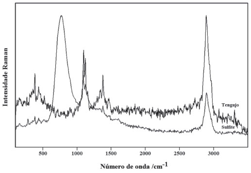 ![]() Figura 8. Espectro FT-Raman do papel japonês Tengujo e do papel sulfite
