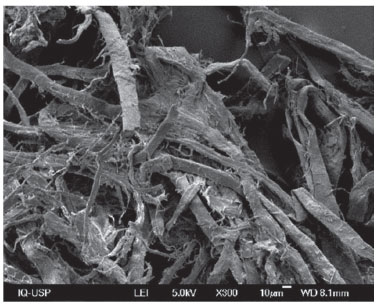 A Tabela 2 evidencia que R' não aporta informação sobre o estado de conservação das fibras porque os valores dos papéis antigos não são estatisticamente diferentes do valor para fibras de algodão moderno; já no caso de R é possível que exista uma correlação quando se consideram fibras de algodão, mas certamente é necessária uma base de dados maior a fim de que procedimentos estatísticos possam ser empregados; de qualquer forma, é importante notar que o tipo de fibra e o tratamento a que são submetidas tem papel significativo, como demonstram os valores de R obtidos para os papéis japoneses. Além da caracterização por espectroscopia vibracional, empregou-se Microscopia Eletrônica de Varredura (SEM) na investigação da morfologia das fibras. A Figura 9 mostra a imagem SEM de um fragmento das fibras do papel do Inventário com ampliação de 300 vezes, em que é possível observar que as fibras são longas e compatíveis com fibras de celulose, apresentando claros sinais de degradação.21 A identificação colorimétrica das fibras foi feita com reagente de Herzberg aplicado sobre algumas fibras removidas do papel do Inventário; após o tingimento e secagem do reagente elas apresentavam coloração avermelhada, o que é característico de polpa de a-celulose22,23 livre de lignina, tal como as fibras de algodão; o papel do Livro também apresentou o mesmo comportamento. É importante frisar, entretanto, que através desse método não é possível diferenciar fibras de algodão, linho ou cânhamo24 e, dessa forma, só foi possível concluir que se trata de papel de trapo, mas não o tipo de trapo usado.