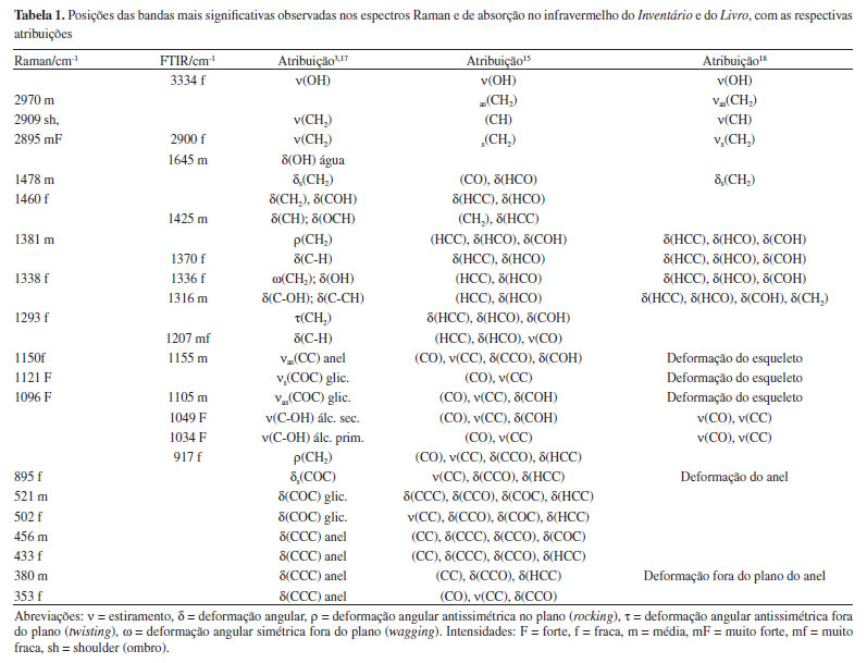 Nos espectros mostrados na Figura 5 (Inventário e Livro) observam-se bandas características de celulose em 379, 435, 565, 1096, 1121, 1151, 1295, 1350, 1393 e 2900 cm-1; como há superposição dos espectros pode-se depreender que ambos os papéis tenham sido feitos com o mesmo tipo de fibra. Devido ao fato das posições e intensidades relativas das bandas serem as mesmas, os valores estão em uma única coluna na Tabela 1 que também apresenta as respectivas atribuições de acordo com diferentes autores. Uma banda intensa aparece em 1645 cm-1 nos espectros µ-FTIR dos papéis do Inventário e Livro e pode ser atribuída à presença de água.