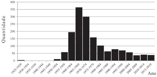 ![]() Figura 1. Número de citações dos artigos de H. Stammreich desde 1924 até 2019: o número de citações segue expressivo mesmo após meio século de sua morte