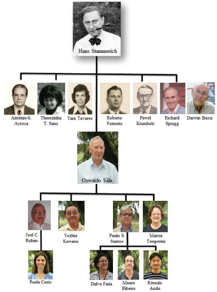 ![]() Figura 2. Diagrama mostrando os principais colaboradores de Stammreich e a estrutura do Laboratório de Espectroscopia Molecular