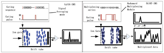 EXPERIMENTAL General method The conventional IMS usually works under the signal averaging mode, which is shown in Figure 1 (a). During each total scan period, the ions are injected only once under the function of the gating sequence. For example, if the gating function is like "1000000000...", each "1" represents opening the ion gate for a short pulse and each "0" means shuttering the ion gate for a short while. Here, the time cost for each "1" or "0" is equivalent. To guarantee the high resolving power, the injection time (about 200 µs) is always limited to no more than 1% of the total scan period (about 30 ms), which forms a low duty cycle (DC), and eventually it leads to low ion throughput and low SNR in conventional SA-IMS.
