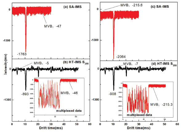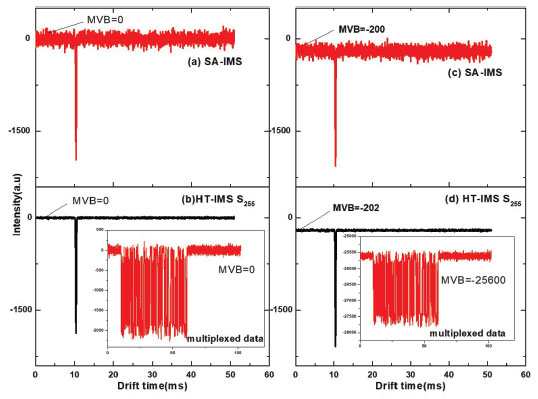 RESULTS AND DISCUSSION Phenomenon of BDA The first group of measurements (average data of SA and HT methods measured in September 2018) are demonstrated in Figure 2(a) and 2(b), where the average experimental temperature is 301K and the average relative humidity is about 41%. As shown in Figure 2(a), the normal reactant ion peak (RIP) is illustrated in the spectrum of SA-IMS. The Mean Value for the Baseline (MVB) of SA-IMS is -47, which is close to 0. In the inset of Figure 2(b), the multiplexed data of Hadamard transform is illustrated, where the order of the S-matrix is 255 and the MVB for the multiplexed data is -46, nearly the same with that of the SA-IMS. Figure 2(b) demonstrates the spectrum of HT-IMS. As we can see, the MVB for HT-IMS is about -5, the drift time for the RIP is the same with that of the SA-IMS.