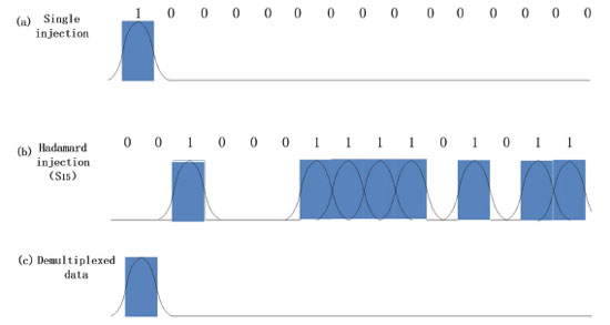 ![]() Figure 3. Spectrum response comparison of single injection and multiplexing injection mode:(a) single injection mode; (b) Hadamard multiplexing injection mode; (c) the demultiplexed data