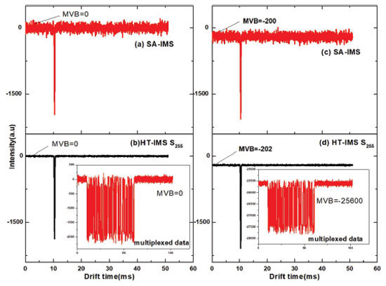 Simulation of SA-IMS and ideal HT-IMS Based on the principle of spectrum response of SA method and Hadamard multiplexing method, the simulation of SA-IMS and ideal HT-IMS is implemented. As shown in Figure 4(a), if the MVB for SA-IMS is 0, the MVB for the multiplexed data of Hadamard method would be 0 too, shown in the inset of Figure 4(b). After the inverse Hadamard transform, the HT-IMS spectrum is shown in Figure 4(b). Obviously, the BDA phenomenon was never found in this section of simulation.
