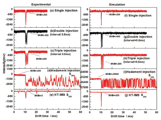 However, according to the actual working condition, the MVB for SA-IMS is not always kept as 0, as shown in Figure 2(c). Accordingly, in the simulation process, we could set the MVB of SA-IMS as -200, thus, the simulation results of SA-IMS and ideal HT-IMS are shown in Figure 4 (c) and (d), respectively. Figure 4(c) is the spectrum of SA-IMS, where the MVB is nearly about -200. According to the theory of Hadamard multiplexing, the multiplexed data are obtained and shown in the inset of Figure 4(d). It is clear that the MVB of the multiplexed data is close to -25600 (here, the order of the S-matrix is 255, according to the theory of Hadamard multiplexing, the Hadamard multiplexed data are convoluted by (m+1)/2 separate spectra, thus the baseline value of the multiplexed data is nearly equal to -200×128), which is far away from -200. Through the inverse Hadamard transform, the demultiplexed data is obtained, as shown in Figure 4(d), where the MVB of the HT-IMS spectrum returns to -200, which is equal to that of the SA-IMS and the BDA phenomenon was not found. In total, whether the MVB of SA-IMS is close to or far away from 0, the MVB for the demultiplexed data of ideal/theoretical HT-IMS is always kept the same with that of SA-IMS, and the BDA phenomenon would not occur. Discover the origin of BDA Through comparison of section 4.1 and section 4.2, it was found that when the MVB of SA-IMS is not equal to 0, and indeed most experimental baseline of the pulsed separation techniques are not equal to 0,1,2,7,14 thus the BDA phenomenon would be generated in HT techniques. It is well known that, whatever for ideal or actual Hadamard multiplexing, the inverse Hadamard transform processes are the same. Thus, the BDA phenomenon must be originated from the Hadamard multiplexing process. In this section, in order to explore the real process of the Hadamard multiplexing and find out the real cause for the BDA artifact, the superposition mechanism are evaluated with simulation and experimental methods, respectively. To carry out the test, the gating sequence for single, double, and triple injection modes are designed as following: Single injection, "1000000000...". In the total scan time, the gate was opened only once. Double injections, "1010000000...". In the total scan time, the gate was opened twice. Triple injections, "1010100000...". In the total scan time, the gate was opened for triple times. As shown in the left side of Figure 5, the experimental results are demonstrated. Figure 5(a-c) demonstrate the spectrum responses to single injection, double injections and triple injections, the average times are set as five. Figure 5(a) shows the spectrum of single injection, and the MVB of the spectrum is about -200. It is clear that the MVBs for the superposition spectra (Figure 5(b) and (c)) are all close to -200, which is the same with that of the single injection mode as shown in Figure 5(a). However, on the right side of Figure 5, the simulation results of single, double and triple injections are illustrated in Figure 5(f-h), respectively. As we can see, the MVB for the single injection is -200, while the MVB for double and triple injection modes are changed to -400 (-200*2) and -600 (-200*3). The main difference between simulation and experimental results is the MVB of the superposition spectra. This indicates that in actual experimental multiplexing process, the signal peak is the superposition of multiple peaks, while the baseline of the multiplexed data would be kept unchanged with that of the single injection mode. However, under ideal simulation Hadamard multiplexing mode, the multiplexed data are the superposition results of multiple independent spectra and so does the baselines of the multiplexed data.