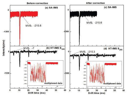 ![]() Figure 6. Comparison of experimental results of HT-IMS before and after correction: (a) and (b) are the results before correction, (a) is the spectrum of SA-IMS; (b) is the spectrum of HT-IMS (the order of the S-matrix is 255); (c) and (d) are the results obtained after correction