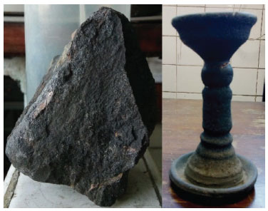 ![]() Figura 2. Esquerda: Amostra de pirolusita (β-MnO2) proveniente da Serra do Navio (AP). Direita: peça em argila revestida por pirolusita da Serra do Navio. Imagens do autor
