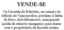 ![]() Figura 6. Reprodução de um anúncio de venda de uma mina de manganês em uma fazenda em Alfredo de Vasconcellos, Minas Gerais, publicada em jornal de grande circulação na Capital Federal (Rio de Janeiro) de janeiro a setembro de 190152