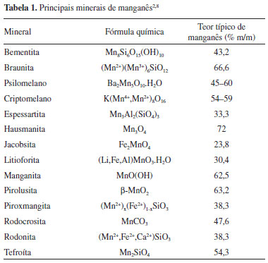 OCORRÊNCIA NA NATUREZA Dos mais de 100 minerais de manganês hoje conhecidos, poucos são empregados na obtenção do elemento.2,8 Os depósitos são abundantes, mas distribuem-se irregularmente no espaço e no tempo geológico.8 Destacam-se os óxidos MnO2 (o mais importante), Mn3O4, Mn2O3, MnOOH, e o carbonato MnCO3. A Tabela 1 apresenta os principais minerais de manganês. A pirolusita é o mineral de maior importância comercial. No fundo dos oceanos (inclusive na costa brasileira), há nódulos metálicos contendo manganês, com uma reserva estimada em 5 x 1011 t do elemento.3,8