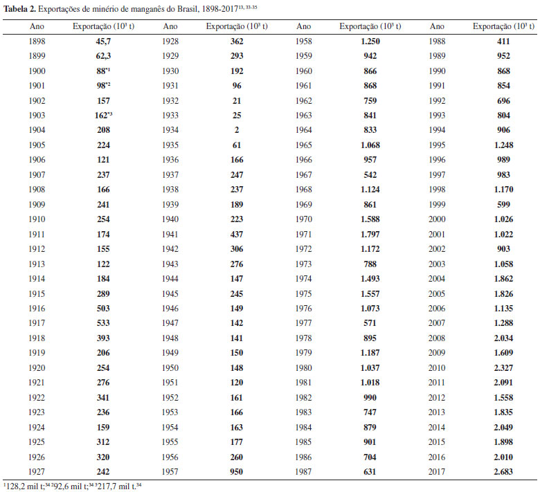 REFERÊNCIAS 1. Greenwood, N. N.; Earnshaw, A.; Chemistry of the Elements, 2nd ed., Elsevier Butterworth-Heinemann: London, 2010, cap. 24; Rocha, R. A.; Afonso, J. C.; Quim. Nova Esc. 2012, 34, 103. 2. Dias, T. G.; Calixto, F.; Manganês, Recursos Minerais de Minas Gerais, Ministério das Minas e Energia: Brasília, 2018, 16 p. 3. Sampaio, J. A.; Andrade, M. C.; Dutra, A. J. B.; Penna, M. T. M. In Rochas & Minerais Industriais - Usos e Especificações; Luz, A. B., Lins, F. A. F., eds.; 2ª ed., Centro de Tecnologia Mineral: Rio de Janeiro, 2008, pp. 633. 4. Weeks, M. E.; Discovery of the Elements, Journal of the Chemical Education, 1945, pp. 237. 5. Christianson, D. W.; Prog. Biophys. Molec. Biol. 1997, 67, 252. 6. Erikson, Keith M.; Ascher, M. In Essential Metals in Medicine: Therapeutic Use and Toxicity of Metal Ions in the Clinic. Metal Ions in Life Sciences; Sigel, A., Freisinger, E., Sigel, R. K. O., Carver, P. L., eds.; De Gruyter GmbH: Berlin, 2019, pp. 253. 7. Santamaria, A. B.; Ind. J. Med. Res. 2008, 128, 484. 8. Abreu, S. F.; Recursos Minerais do Brasil, 2ª ed., Instituto Nacional de Tecnologia: Rio de Janeiro, 1973, vol II, pp. 492. 9. Lima, T. M.; Neves, C. A. R.; Sumário Mineral Brasileiro 2015, Departamento Nacional de Produção Mineral: Brasília, 2015, pp. 80-82. 10. Anuário Mineral Brasileiro 2017, Ano-Base 2016. Brasília: Departamento Nacional de Produção Mineral, 2017, 43 p. 11. Quaresma, L. F.; Perfil da Mineração do Manganês - Relatório Técnico 19. Contrato nº 48000.003155/2007-17: Desenvolvimento de estudos para elaboração do plano duodecenal (2010 - 2030) de geologia, mineração e transformação mineral. Ministério das Minas e Energia: Brasília, 2009, 40 p. 12. Plano Nacional de Mineração 2030 - Geologia, Mineração e Transformação Mineral. Ministério das Minas e Energia: Brasília, 2011, 180 p. 13. Heider, M.; Amarante, J. L.; In the Mine 2018, 72, 9. 14. O Jornal do Rio de Janeiro, 21 de novembro de 1948, p. 4. 15. O Manganez e a sua Producção - a luta entre o grande e o pequeno produtor. Correio da Manhã, Rio de Janeiro, 20 de dezembro de 1930, p. 10. 16. Heider, M.; Amarante, J. L.; In the Mine 2018, 73, 9. 17. Paiva Netto, I. E.; An. Assoc. Quim. Bras. 1941, 1, 159; Paiva Netto, I. E.; An. Assoc. Quim. Bras. 1941, 1, 42; Paiva Netto, I. E.; An. Assoc. Quim. Bras. 1942, 1, 126. 18. Candia, M. A. F.; Girardi, V. A. V.; Boletim do Instituto de Geociências da USP 1979, 10, 19. 19. Ribeiro Filho. E.; Boletim do Instituto de Geociências da USP 1973, 4, 87. 20. Barbosa. A. F.; Almeida, F. F. M.; Nogueira Filho, J. V.; Santos, T. D. S.; Mazzarella, V.; Manganês. Geologia e Metalurgia, boletim no 19. São Paulo: Escola Politécnica da Universidade de São Paulo, 1959, 118 p. 21. Wertime, T. A.; The coming of the age of steel. University of Chicago Press: Chicago, 1962. 22. Drummond, J. A.; Pereira, M. A. P.; O Amapá nos tempos do Manganês: um estudo sobre o desenvolvimento de um estado amazônico - 1943-2000, Garamoud: Rio de Janeiro, 2007. 23. Santana, A. L.; Manganês. Departamento Nacional de Produção Mineral: Brasília, 2017, pp. 117. 24. Ibiapina, V. F.; Florentino, U. S.; Afonso, J. C.; Gante, V.; Vianna, C. A.; Mantovano, J. L.; Quim. Nova 2018, 41, 176. 25. Paulino, J. F.; Busnardo, N. G.; Afonso, J. C.; Quim. Nova 2007, 30, 718. 26. Silva, R. G.; Afonso, J. C.; Mahler, C. F.; Quim. Nova 2018, 41, 581. 27. Pletcher, D.; Walsh, F. C.; Industrial Electrochemistry, 2nd ed., Springer: Berlin-Heidelberg, 2012, pp. 275. 28. Silva, L. H. C. P.; Campos, H. D.; Silva, J. R. C.; Reis, E. M.; Summa Phytopathol. 2015, 41, 64. 29. Sistema de Análise das Informações de Comércio Exterior. MDIC - Ministério da Indústria, Comércio Exterior e Serviços, SECEX - Secretaria de Comércio Exterior. Disponível em http://comexstat.mdic.gov.br/pt/home/, acessada em outubro 2019. 30. Informe Mineral, julho/dezembro 2012. Departamento Nacional de Produção Mineral: Brasília, 2012, p. 3; Informe Mineral, janeiro/junho 2018. Departamento Nacional de Produção Mineral: Brasília, 2012, p. 4. 31. Silva, B. O.; Câmara, S. C.; Afonso, J. C.; Neumann, R.; Alcover Neto, A.; Quim Nova 2011, 34, 812. 32. https://www.consumidormoderno.com.br/2019/02/13/energizado-mercado-pilhas-brasil, acessada em outubro 2019. 33. Brasil em Dados '75. Rio Gráfica e Editora: Rio de Janeiro, 1975, pp. 121. 34. Vieira, L. M.; Números Sobre o Manganês Brasileiro. Rio de Janeiro: O Observador Econômico e Financeiro, 1949, no 161, p. 48-53; Almanaque Brasileiro Garnier, anno 1. Rio de Janeiro: Livraria Garnier, 1903, p. 155; anno 2, 1904, p. 165; anno 4, 1906, p. 179. 35. Economia Mineral do Brasil 2018. Instituto Brasileiro de Mineração, Brasília, 2018, 30 p. 36. Producção de Manganez. Retrospecto Commercial do Jornal do Commercio. Jornal do Commercio: Rio de Janeiro, 1926, p. 319. 37. Jones, T. S.; Manganese. The US Department of the Interior, Mineral Facts and Problems - 1985 Edition. Bureau of Mines Bulletin: Washington, 675, 1985, p. 484. 38. Camara, A. A.; O Manganez no Estado da Bahia. Revista do Instituto Polytechnico Brazileiro, Rio de Janeiro, 1906, Tomo XXXI, pp. 17-28. 39. Burlamaque, F. L. C.; Riquezas Mineraes do Brasil. O Auxiliador da Indústria Nacional, 1850, n. 6, p. 118. 40. Lisboa, M. A. R.; Oeste de S. Paulo, sul de Mato-Grosso: geologia, industria mineral, clima, vegetação, solo agrícola, industria pastoril. Typographia do Jornal do Commercio: Rio de Janeiro, 1909. 41. O Auxiliador da Indústria Nacional, 1843, n. 1, p. 143. 42. Regulamento Sanitário de 14 de fevereiro de 1850. Relatório do ano de 1849 apresentado à Assembleia Geral Legislativa na 2ª Sessão da 8ª Legislatura. Tipografia Nacional: Rio de Janeiro, 1850, p. 2 (artigo 11º). 43. Elementos de Technologia - Metaes e suas aplicações, O Auxiliador da Indústria Nacional, 1883, 51, p. 198; Chimica Mineral (1) - Metaes, O Auxiliador da Indústria Nacional, 1884, 52, p. 250