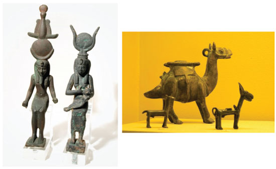 ![]() Figura 4. Bronzes antigos das coleções do Museu Nacional, em fotos de antes do incêndio de 2 de setembro de 2018: (A) conjunto egípcio com os deuses Osíris e Ísis, essa amamentando o infante Hórus; (B) família de lhamas da cultura inca. O bronze, uma liga de cobre e estanho em proporções variadas, é uma liga muito mais dura e resistente que qualquer dos metais componentes. Ele foi descoberto independentemente em várias culturas e deu origem a uma era da evolução cultural da humanidade