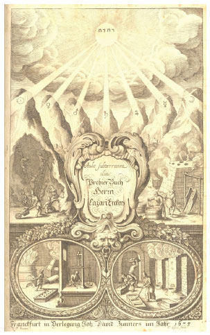 ![]() Figura 5. Frontispício da segunda edição do livro Aula Subterranea, de Lazarus Ercker, de 1673. Aqui está mostrado alegoricamente como Deus envia por raios solares os metais às entranhas das montanhas, de onde os homens extraem os minérios e deles obtêm os metais4