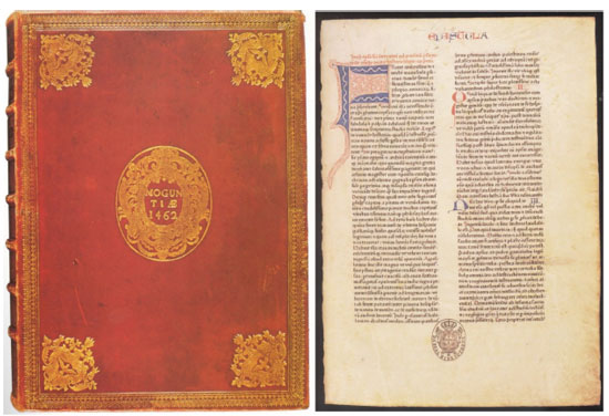 ![]() Figura 6. O livro impresso mais antigo existente no Brasil, a Bíblia de Mogúncia, impressa em dois volumes nessa cidade alemã em 1462, usando tipos móveis de liga metálica de Sb, Sn e Pb. As fotos mostram a capa do primeiro volume e uma página com inicial desenhada. Fundação Biblioteca Nacional5