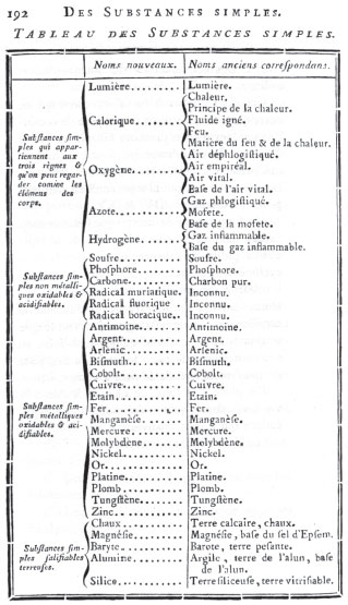 ![]() Figura 7. A Tabela dos 33 elementos de Lavoisier, publicada em seu livro principal, Traité Élémentaire de Chimie, de 17899