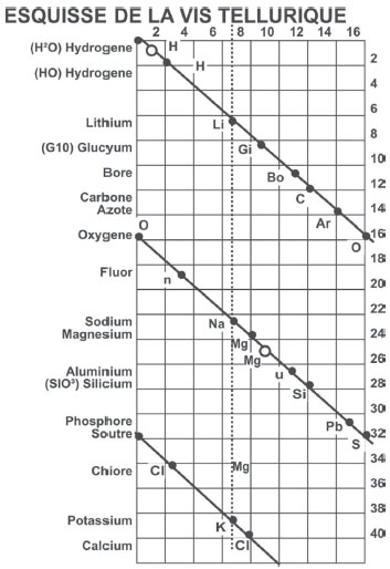 ![]() Figura 9. Os elementos dispostos da forma proposta por de Chancourtois, segundo o chamado "parafuso telúrico" (vis tellurique). Pode-se ver bem como elementos de propriedades semelhantes ficam na mesma vertical17