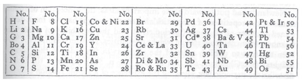 É curioso que a numeração dos elementos poderia ser chamada de uma sequência de "números atômicos", décadas antes que essa expressão surgisse, mas em outro contexto. Newlands foi obrigado a fazer uma inversão na tabela, como entre Te (nº 43) e I (nº 42), por puro pragmatismo, para atender à necessidade de colocar juntos elementos de propriedades semelhantes, assim como mais tarde faria Mendeleev. Apesar de sua ideia conter a semente de algo que frutificaria no futuro, ele foi muito criticado, ainda mais que a periodicidade não funcionava bem quando entravam em cena os elementos de transição. Ao apresentar suas ideias numa reunião da Chemical Society, em Londres, ele foi ridicularizado pelo Prof. George Carey Foster (1835-1919), que lhe perguntou se ele não havia também experimentado arranjar os elementos na ordem de suas letras iniciais e daí tirar conclusões químicas. O resultado de tudo isso foi que a Chemical Society recusou publicar a comunicação de Newlands. Muitos anos depois, após o triunfo da tabela de Mendeleev, em 1887, Newlands foi reconhecido e a Royal Society lhe concedeu a Medalha Davy por seu papel pioneiro.19