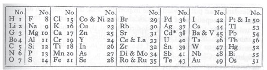 ![]() Figura 10. A Tabela das Oitavas de Newlands, por ele publicada em 1865, com 62 elementos, mostrando como após cada 7 elementos, dispostos nas colunas, iniciava-se uma nova oitava, como na música