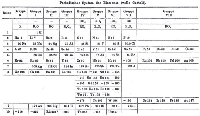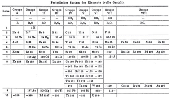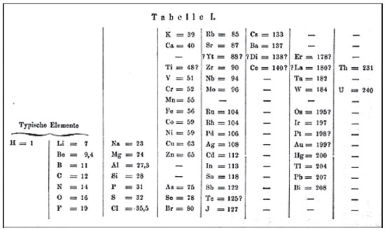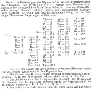 ![]() Figura 12. A primeira Tabela de Mendeleev em alemão, publicada no mesmo ano de 1869, com o título (traduzido) de "Sobre as Relações das Qualidades para os Pesos Atômicos dos Elementos"26