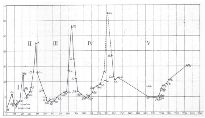 ![]() Figura 16. Curva de volume atômico contra peso atômico, apresentada por Lothar Meyer em 1870, mostrando a variação periódica dessa propriedade. Como exemplo, os máximos da curva são todos ocupados pelos elementos alcalinos31