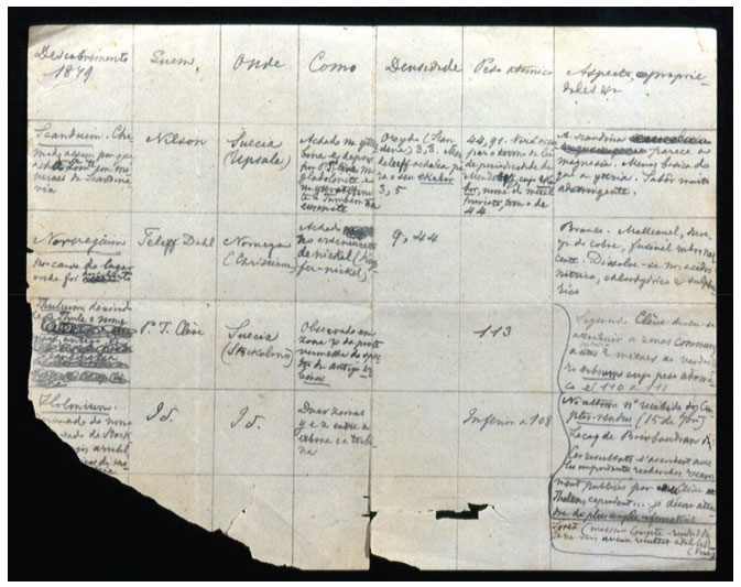 ![]() Figura 17. Manuscrito de D. Pedro II, com sua tabela relativa aos novos elementos descobertos (1879). Fundação Maria Luísa e Oscar Americano, São Paulo