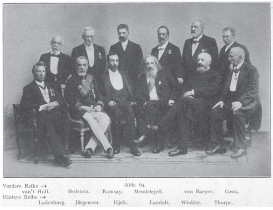 ![]() Figura 18. Foto tirada em 1900, quando da celebração do jubileu de 200 anos da Academia Prussiana das Ciências, em Berlim. Aparecem sentados: Jacobus Henricus van't Hoff (Holanda), Friedrich Konrad Beilstein (Rússia), William Ramsay (Escócia), Dmitri Mendeleev (Rússia), Adolf von Baeyer (Alemanha), Alfonso Cossa (Itália); em pé: Albert Ladenburg (Alemanha), Sophus Mads Jørgensen (Dinamarca), Edvard Hjelt (Finlândia, na época parte do Império Russo), Hans Heinrich Landolt (Alemanha), Clemens Alexander Winkler (Alemanha), Thomas Edward Thorpe (Inglaterra). Esta foto consta da biografia de van't Hoff publicada em 1912, um ano após sua morte, e mostra vários químicos envolvidos diretamente com a criação e desenvolvimento da Tabela Periódica e seus novos elementos39
