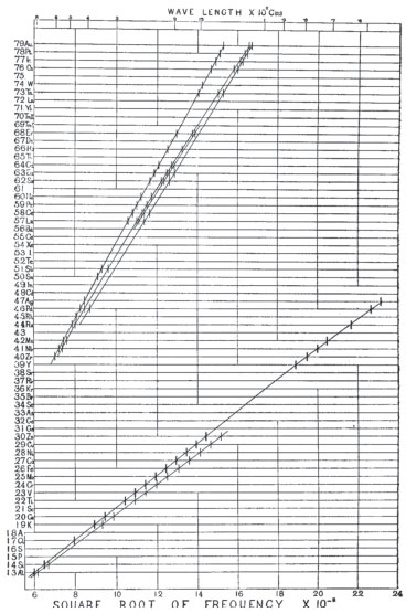 ![]() Figura 20. O gráfico de Moseley, relacionando a sequência dos elementos na Tabela Periódica, denominada por ele de sequência de números atômicos, contra um parâmetro relacionado à raiz quadrada da frequência dos raios X para cada elemento62