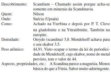 O manuscrito parece ser uma folha de caderno, escrito a lápis na difícil grafia do Imperador, que estava longe de ser um calígrafo. Trata-se de anotações para estudo a respeito de quatro novos elementos, com a data 1879 escrita pelo Imperador, o próprio ano da descoberta do escândio pelo químico sueco Lars Nilson. O documento está em forma de uma tabela, composta de sete colunas rotuladas Descobrimento, Quem, Onde, Como, Densidade, Peso atômico, e Aspecto, Propriedades, etc. O primeiro elemento é o escândio, o qual vem assim descrito, mantendo-se a grafia do Imperador: ![]() Os elementos seguintes na tabela de D. Pedro II são o norvégio, o túlio e o hólmio. O norvégio foi um equívoco científico, pois o que se supunha ser um novo elemento mostrou-se depois ser uma mistura de ítrio e háfnio. No entanto, sua "descoberta" e consequente relato pelo mineralogista norueguês Tellef Dahll ocorreu também no ano de 1879, o que novamente mostra a atualização do Imperador face às publicações científicas de seu tempo.33 Ao descrever como foi descoberto o túlio, o Imperador demonstra ter conhecimento de espectroscopia: "Observado em zona x da parte vermelha do spectro do antigo erbium." Já ao tratar do hólmio, evidencia com minúcias sua familiaridade com a literatura corrente, que ele recebia como membro da Academia das Ciências de Paris. O interessante é que o Imperador lia, anotava e comentava os trabalhos científicos sobre o assunto publicados nos Comptes Rendus (dados neste caso nas referências 34 e 35), o periódico oficial da Academia, como se pode constatar aqui. Este é o texto de D. Pedro II: "No último nº recebido dos Comptes Rendus (15 de jan) Lecoq de Boisbaudran diz: Ces résultats s'accordent avec les importantes recherches récemment publiées par M. de Cleve et Thielen, cependant ... je désire attendre de plus amples informations. Soret (mesmo Comptes Rendus) diz: Je ne vois aucun résultat établissant que l'holmium soit um corps différent. Acrescenta: Si ni moi ni M. Marignac ... nous n'avons pas tiré alors de conclusion positive de ces faits c'est qu'il nous a paru que ... il est peut-être prématuré d'affirmer l'existence d'um élément nouveau quand il est encore impossible de l'isoler et d'en determiner les caractères chimiques, en se basant seulement sur la présence d'une unique raie du spectre d'absorption." Tradução do texto: "Estes resultados concordam com as importantes pesquisas publicadas recentemente por M. Cleve e Thielen, entretanto .... desejo esperar informações mais amplas. Soret (mesmo Comptes Rendus) diz: Não vejo qualquer resultado estabelecendo que o hólmio seja um corpo diferente. Acrescenta: Se nem eu nem M. Marignac ... tiramos então conclusão positiva destes fatos é porque pareceu-nos que ... é talvez prematuro afirmar a existência de um elemento novo quando é ainda impossível isolá-lo e determinar-lhe os caracteres químicos, baseando-se apenas na presença de uma única raia do espectro de absorção." No caso do artigo de Lecoq de Boibaudran, o Imperador faz uma citação ligeiramente modificada, ao passo que quanto a Soret sua citação é literal, o que é notável em termos de sua acurácia em relatar uma publicação científica que havia lido.34,35 Um outro pormenor interessante é a anotação de D. Pedro II ao dizer que ele havia lido os textos citados "no último nº recebido dos Comptes Rendus (15 de jan)". Ora, os dois artigos haviam sido publicados em 15 de setembro de 1879, logo a data anotada pelo Imperador deve ter sido aquela do recebimento da revista por ele no Rio de Janeiro, que deve referir-se a 15 de janeiro de 1880, o que dá uma ideia do tempo necessário para se receber uma revista científica europeia no Brasil. Não se conhece outro governante no mundo, no século XIX, com esse interesse e familiaridade com a ciência. Desse modo, D. Pedro II estava absolutamente em dia com a Química de seu tempo, talvez até mais atualizado que muitos professores da disciplina no Brasil da época.
