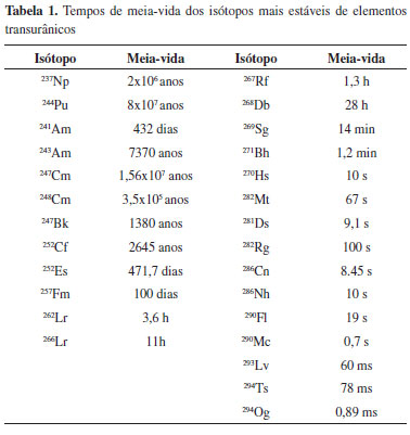 A descoberta desses elementos sintéticos foi um passo importante para a preparação em Berkeley de novos transurânicos, oriundos de investigações dos grupos de pesquisa de Seaborg ou Albert Ghiorso (1915 - 2010). Todos esses elementos possuem meias-vidas de anos ou dias (Tabela I). O berquélio (Bk, Z= 97), obtido em 1949 pelo bombardeamento de 241Am com partículas alfa, homenageou a cidade de Berkeley.74 Em seguida o estado americano da Califórnia foi a origem do nome do califórnio (Cf, Z=98), preparado em 1950, pelo bombardeamento de 242Cm com partículas alfa. Antes de suas preparações, o einstênio (Es, Z=99) e o férmio (Fm, Z=100) foram detectados em 1952 em locais de testes com bombas de hidrogênio, sendo em seguida produzidos em quantidades pequenas em reatores nucleares; no caso do Es, através da reação nuclear entre 14N e 238U ou do decaimento do 253Cf, e do Fm pelo bombardeamento do 238U com nêutrons. Estes elementos renderam homenagem a Albert Einstein (1979-1955) e Enrico Fermi (1901-1954).75 O elemento 101, mendelévio (Md, Z=101) foi preparado em 1955 pelo bombardeamento do 253Es com partículas alfa no cíclotron de Berkeley. Devido à guerra fria, Seaborg teve de solicitar autorização ao governo americano para homenagear Dmitri Mendeleev, ao dar o nome de um russo a esse novo elemento.76 O férmio é o elemento mais pesado a ser obtido por bombardeamento de actinídeos com nêutrons. Para se obter elementos com Z>100 foi necessário efetuar o bombardeamento de elementos alvos com íons. Uma característica interessante é a existência fugaz desses elementos pesados, o que dificultou bastante a caracterização e validação dos resultados. Outra questão que envolveu as pesquisas da década de 1950 ao início da década de 1980, foi a acirrada disputa entre soviéticos e americanos, que precisou ser mediada pela IUPAC. A descoberta do nobélio, (No, Z=102), nome dado em referência a Alfred Nobel (1833-1896), foi creditada em 1997 pela IUPAC aos soviéticos, que efetuaram em 1966 a fusão nuclear do 238U com íons de neônio em Dubna. Os americanos, liderados por Seaborg, relataram em 1958 a preparação desse elemento usando um novo acelerador da Universidade da Califórnia em Berkeley, por bombardeamento de mistura de isótopos de cúrio, composta por 95% de 244Cm e 5% 246Cm) com íons de 13C e 12C. Entretanto, houve questões não apropriadamente respondidas por esses pesquisadores. A IUPAC acatou a sugestão de nome feita por suecos, que chegaram a descrever a preparação desse novo elemento na década de 1950.77 O laurêncio (Lr, Z=103) é o último dos actinídeos. Novamente, devido a sua curta existência e dificuldade em caracterizar seus decaimentos de forma segura, a acirrada disputa entre americanos e soviéticos continuou. Seus isótopos mais estáveis são 262Lr e 266Lr. A IUPAC inicialmente atribuiu sua descoberta aos americanos, tendo até aceitado o nome em honra de Ernest Orlando Lawrence (1901-1958), inventor do acelerador de partículas. Mas em 1997 o caso foi reavaliado e sua descoberta foi atribuída a ambos os grupos de pesquisadores, soviéticos e americanos. O grupo americano do Lawrence Berkeley National Laboratory, liderado por Ghiorso, obteve este elemento ao bombardear 248Cm com íons de 14N, ou 252Cf com diferentes isótopos de boro (10B ou 11B). Já o grupo russo efetuou a fusão de 243Am com 18O. Os elementos de número atômico 104 a 118 completaram o sétimo período da tabela periódica, indo do eka-háfnio ao eka-radônio. Eles são denominados elementos artificiais superpesados, e são constituídos por vários isótopos, todos com meias-vidas bastante curtas. O primeiro deles, o rutherfórdio (Rf, Z=104), foi detectado em 1964 pelos soviéticos em Dubna, ao bombardearem 242Pu com 22Ne. Em 1969, pesquisadores da Universidade da Califórnia sintetizaram esse mesmo elemento fazendo a fusão nuclear do 249Cf com 12C. Os soviéticos propuseram o nome de kurchatóvio em honra de Igor Vasilyevich Kurchatov (1903-1960), um dos fundadores do grupo soviético de pesquisa, enquanto os americanos chamaram-no de rutherfórdio em homenagem a Ernest Rutherford. Em 1997 ambos os grupos de pesquisa concordaram em chamá-lo de rutherfórdio (Rf).77 Os soviéticos coordenados por Flerov prepararam o elemento 105 pela primeira vez em 1968 por bombardeamento de 243Am com 22Ne. Dois anos depois, pesquisadores da Universidade da Califórnia relataram sua obtenção pelo bombardeamento de 249Cf com 15N. A proposta de nome para este elemento fez parte da mesma controvérsia envolvendo a descoberta do Rf. Houve várias propostas de nomes, sendo ele inicialmente chamado de nielsbóhrio (Ns) pelos soviéticos, em homenagem a Niels Bohr (1885-1962), ou hahnium pelos americanos em honra de Otto Hahn. Em 1997 a IUPAC chegou a um consenso em relação aos elementos de número atômico 104 a 106. O novo elemento 105 recebeu o nome de dúbnio em referência à cidade russa onde se localiza o Joint Institute for Nuclear Research.78 A descoberta do seabórgio (Sg, Z=106) foi anunciada em 1970 por Ghiorso, sendo confirmada apenas em 1974, como produto da reação nuclear entre 249Cf e 18O. Nesse ano os soviéticos de Dubna, liderados por Yuri Tsolakovich Oganessian (1933- ), também anunciaram sua preparação, o que manteve a disputa com os americanos. A sugestão do nome searbórgio foi feita pelos americanos, em homenagem a Seaborg, sendo apenas ratificada pela IUPAC em 1997, que creditou sua descoberta a ambos os grupos.79 Até essa data adotou-se o padrão de nomenclatura de novos elementos químicos, chamando-o de unnilhexio.80 A preparação de novos elementos artificiais na década de 1980 foi marcada positivamente pelo surgimento de grupos de pesquisas em física ou química nuclear fora dos Estados Unidos da América ou da União Soviética. O bóhrio (Bh, Z = 107) havia sido anunciado pelo grupo de pesquisa de Dubna em 1976, liderado por Oga