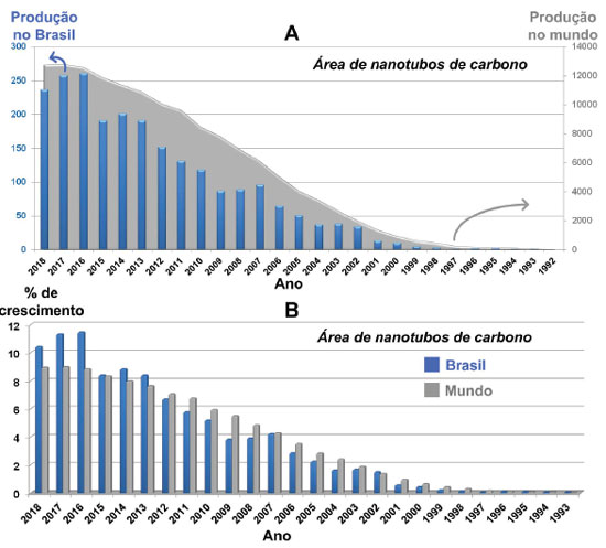 ![]() Figura 1. Produção científica na área de nanotubos de carbono, no mundo e no Brasil, obtido pelo "Web of Science" em Julho/2019, dado A) em números totais e B) em porcentagem de crescimento