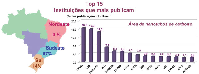 Outra análise interessante é se considerar aonde essas pesquisas vêm sendo realizadas. A Figura 2 apresenta as 15 instituições que mais publicaram em nanotubos de carbono no Brasil, no período de 1993-2018. Essas instituições representam 90% de toda publicação brasileira, e são todas universidades públicas, sendo 13 federais e 2 estaduais de São Paulo. Nota-se ainda que dentre as 15 instituições que mais publicam no Brasil, tem-se cerca de 9%, 67% e 14% na região Nordeste, Sudeste e Sul, respectivamente.